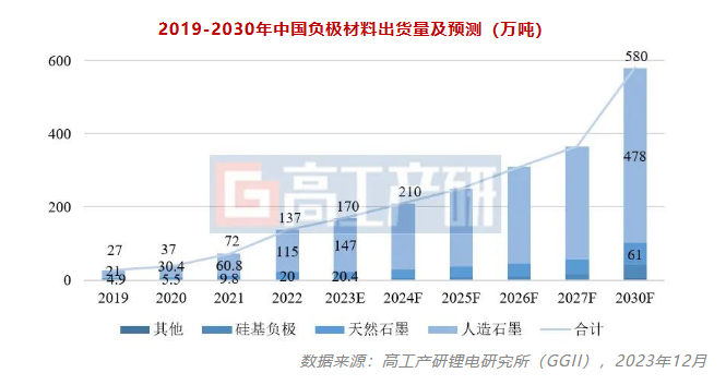 首先,從市場(chǎng)空間來(lái)看,面向TWh時(shí)代,負(fù)極材料市場(chǎng)仍具持續(xù)增長(zhǎng)潛力。GGII預(yù)計(jì),2030年我國(guó)負(fù)極材料出貨量有望達(dá)到580萬(wàn)噸,其中人造石墨仍為市場(chǎng)主流,出貨量超470萬(wàn)噸。